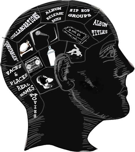 The design itself is the side profile of a head and the head is divided into sections (think phrenology) with the inner sections being graphics; a microphone, a turntable, headphones, a boombox,a spray can, a silhouette of a break dancer, and a cassette tape. The outer sections will be words that reflect the actual categories of the hip hop trivia categories.Those words/categories are; Album Titles, Hip Hop Groups, Album Release Dates, Collaborations, Faces and Places, "Quotables", Real Names, Movies.