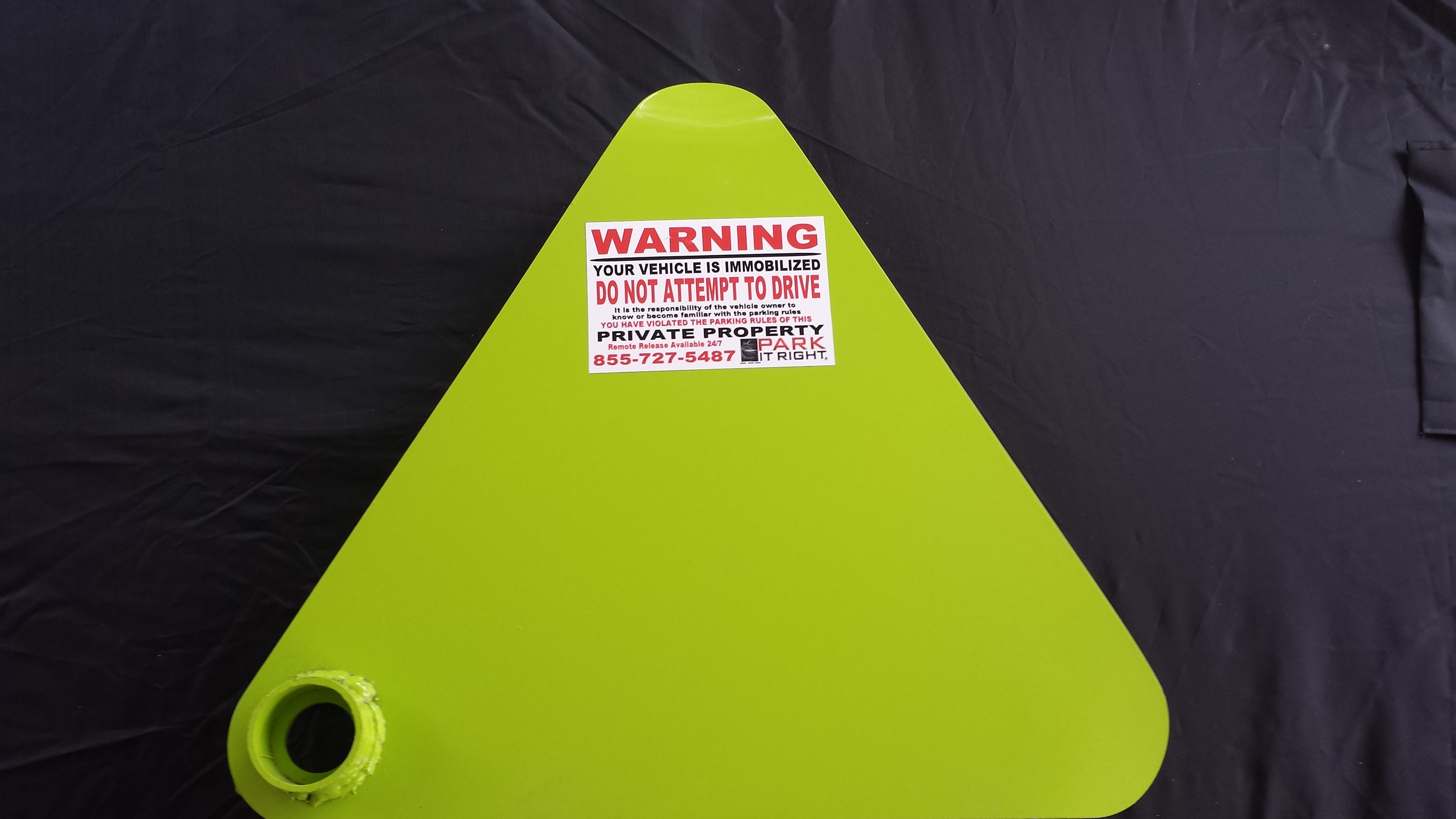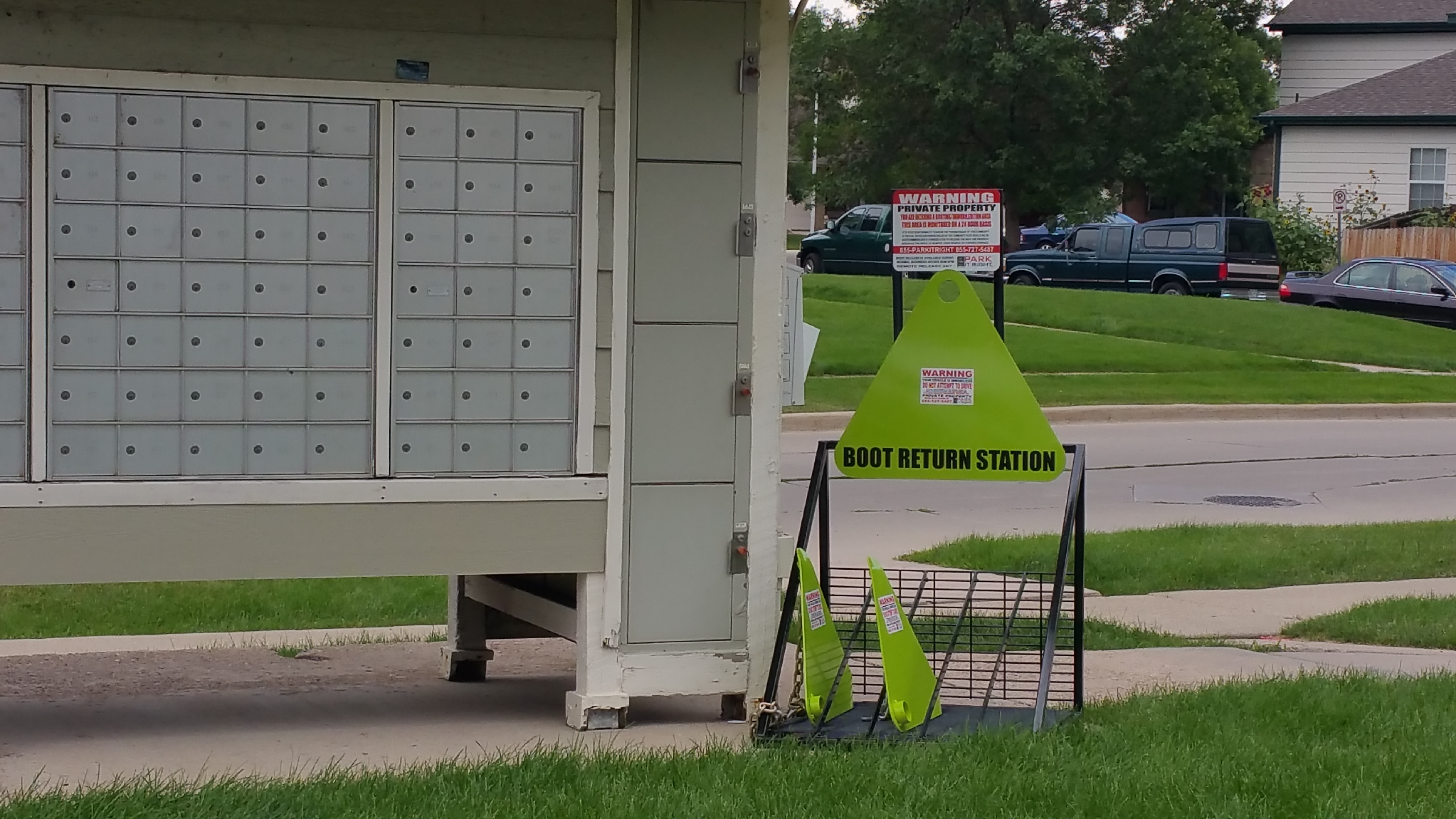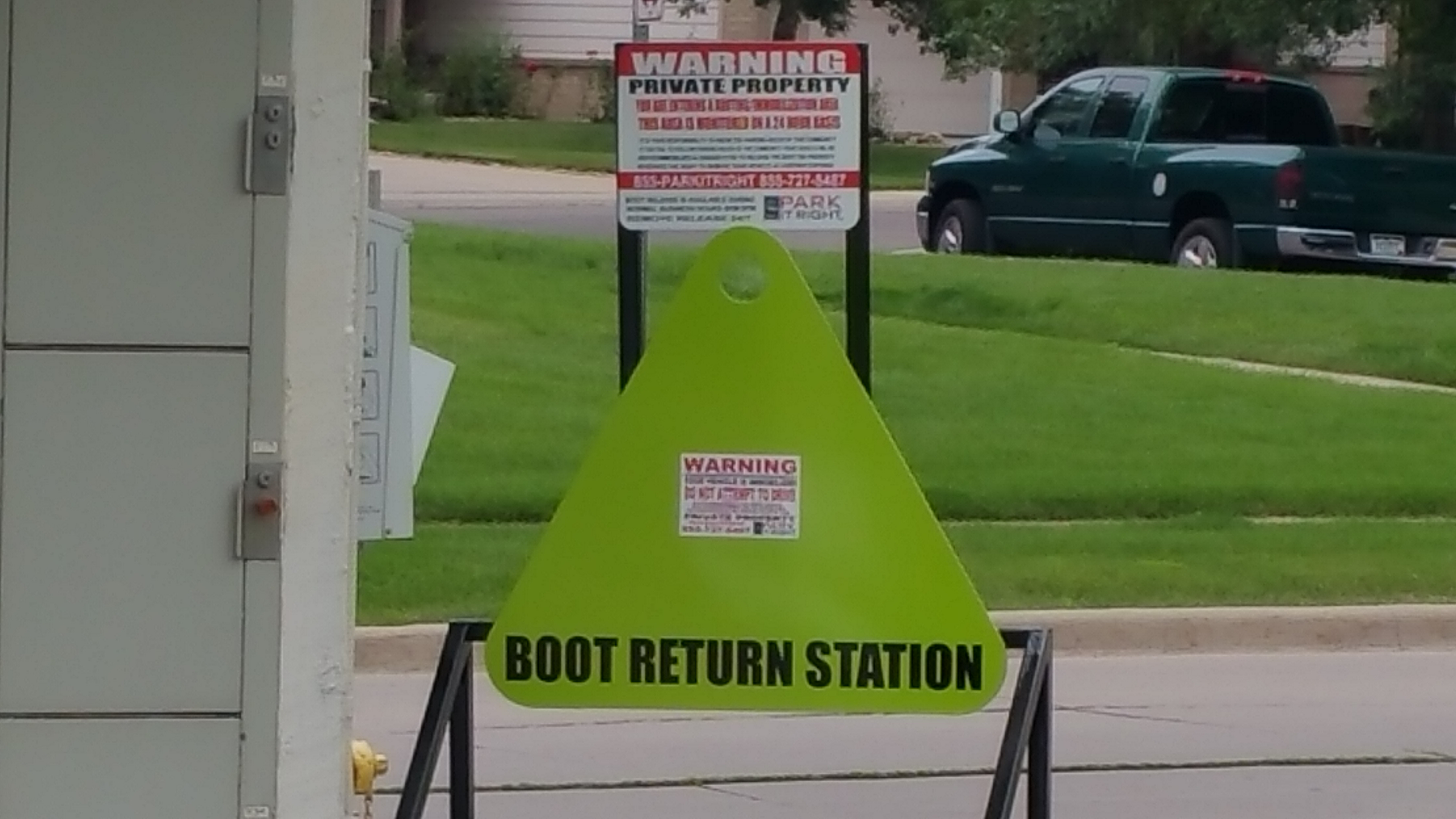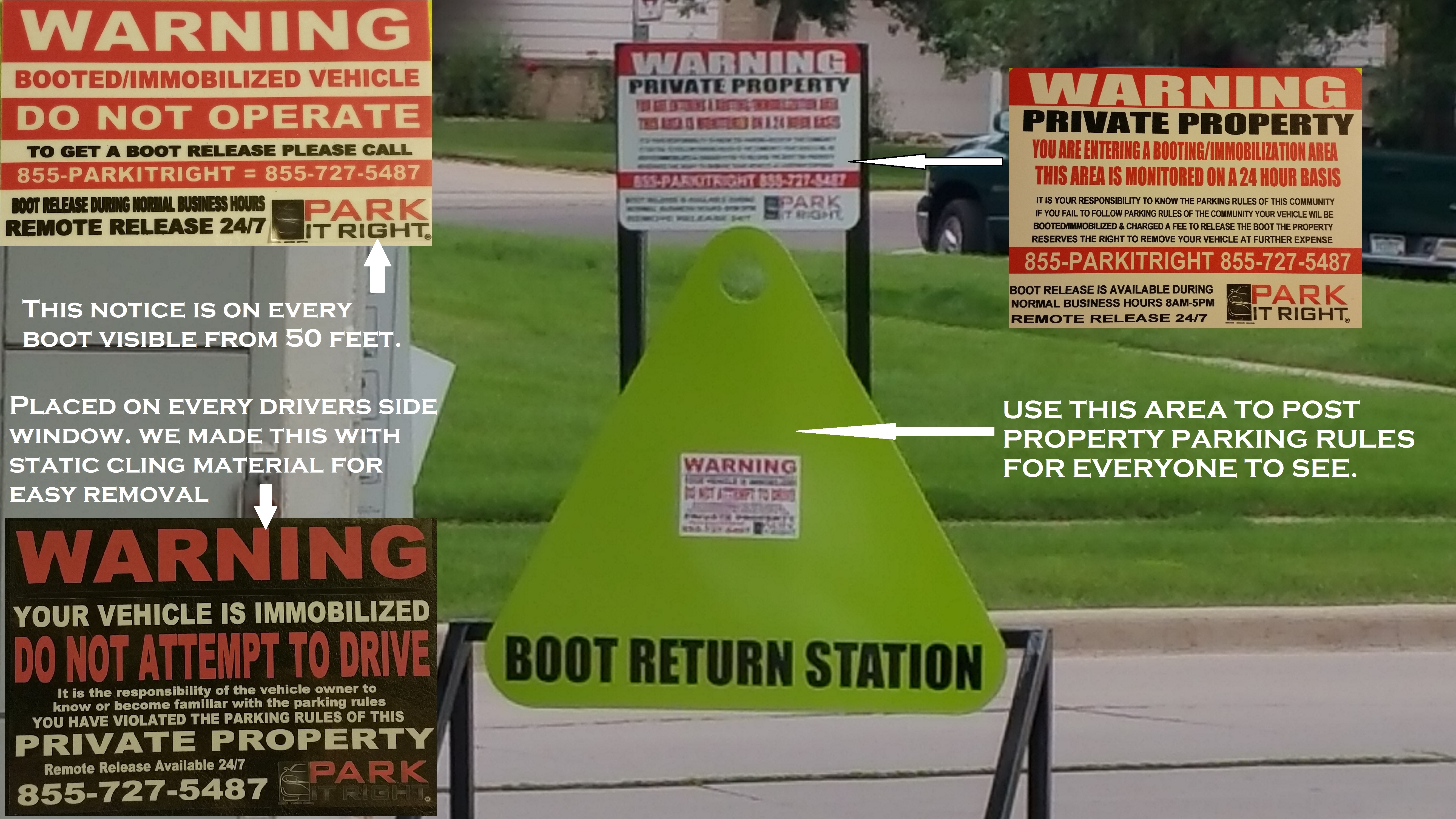 - Green boot visual reinforcement, property parking rule post area, private property warning sign area, boot return area where boots can be locked into place