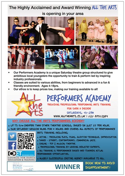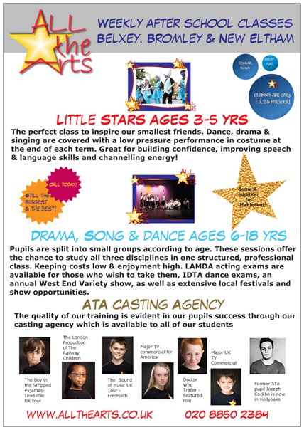 All the Arts Theatre School offer affordable training in all aspects of performing arts for children & teens ages 3-18yrs.We offer our Award winning after-school classes as well as our Saturday Performers Academy.We offer unparalleled performance opportunities for local children and current pupils are in major TV commercials, West End Shows and large scale productions through our in-house children TV & Theatrical agencyWe are established 13 years and all of our staff are highly skilled industry professionals as well as qualified, CRB checked & first aid trained.Our classes are in Bexley, New Eltham & Bromley and we train a large amount of boys as well as girls and offer the chance to take examinations in drama through LAMDA and the IDTA dance examination board with a 100% pass rate.We recently won the Bromley Business Award and we are one of the few local theatre schools accredited by the Council of Dance Education & Training.Former pupils have won major roles in TV series 's including Hollyoaks and From the Cradle to the Grave.We need a flyer/postcard that is eye-catching & fun to children advertising the opportunity for them to take part in our next production 'Maleficent' the Pantomime which will be performed in the brand new theatre space in The Centre at New Eltham in December.The flyer should be dramatic and mention that we are industry, qualified professional's and an accredited theatre school. It should display our logo and website and mention that we also run weekly classes with the opportunity to take part in full-scale productions,exams through LAMDA & IDTA and that we have a hugely successful professional casting agency for TV and Theatre I attach a previous flyer for your perusal, but we feel that it is far to wordy, spread over two pages (front & back) with a lot of information on, so the whole thing needs to be condensed and focus on Maleficent, yes still mention all the rest of our USP's ( affordable, exams, shows, agency, accreditation etc)website is www.allthearts.co.uk phone: 020 8850 2384