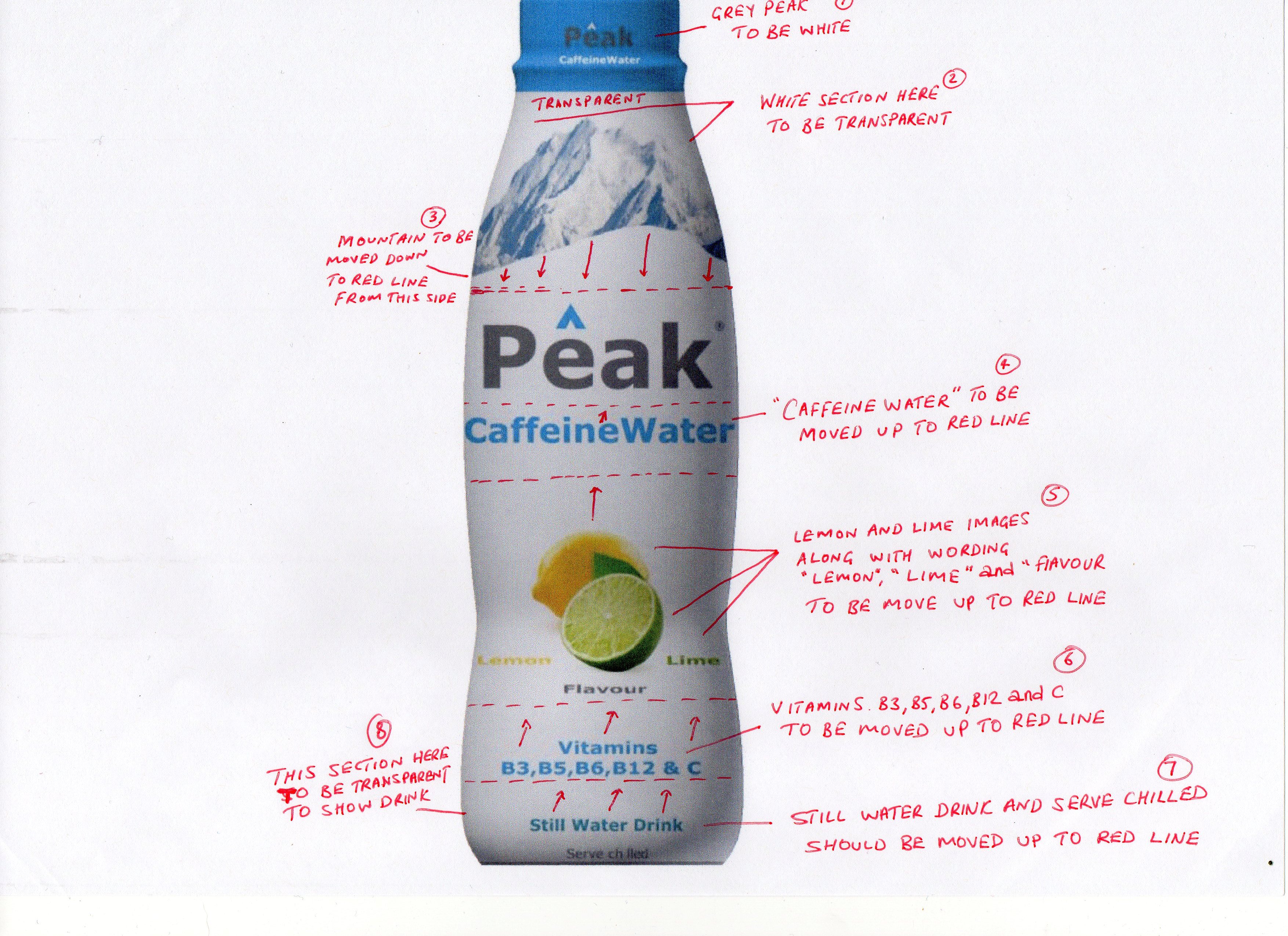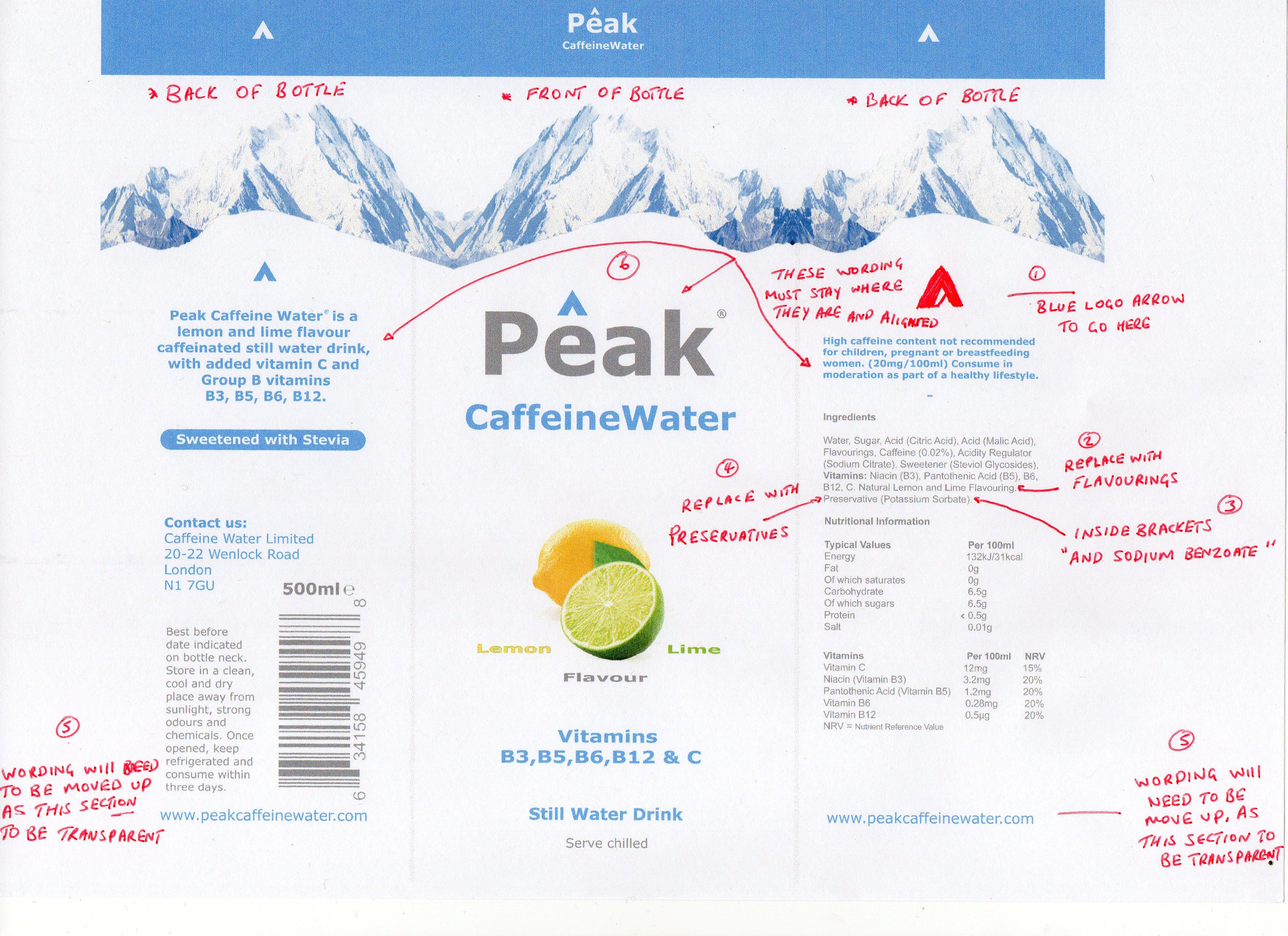 I need some edits and adjustments to the label for my drink Peak Caffeine Water.