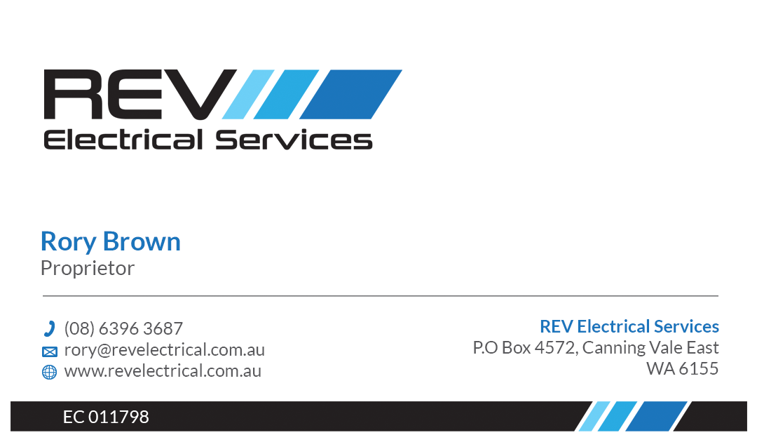 - company logo and information such as postal address, website, contact email "service@revelectrical.com.au" and phone number.