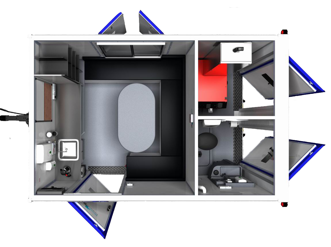 Our mobile welfare units are self-powered and self-sufficient, with electric heating and lighting provided by a diesel generator.