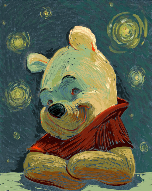 1) Artwork must mimic closely the style of the chosen artist's work, including color choice, setting, and brush stroke style/detail. An example for Van Gogh has been included, using Winnie the Pooh.