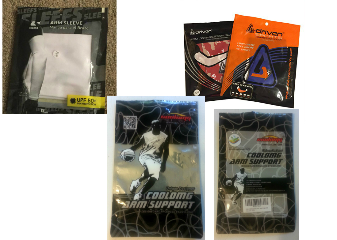 I have included a few samples of other arm sleeve brands packaging. The sleefs package i like the "Sleefs" scrolling across package, the bdriven package i like the different colors, although I would not want the same colors, The cooloomg i like that the name of company, & the item are in bold. I do not like the basketball player on the front.