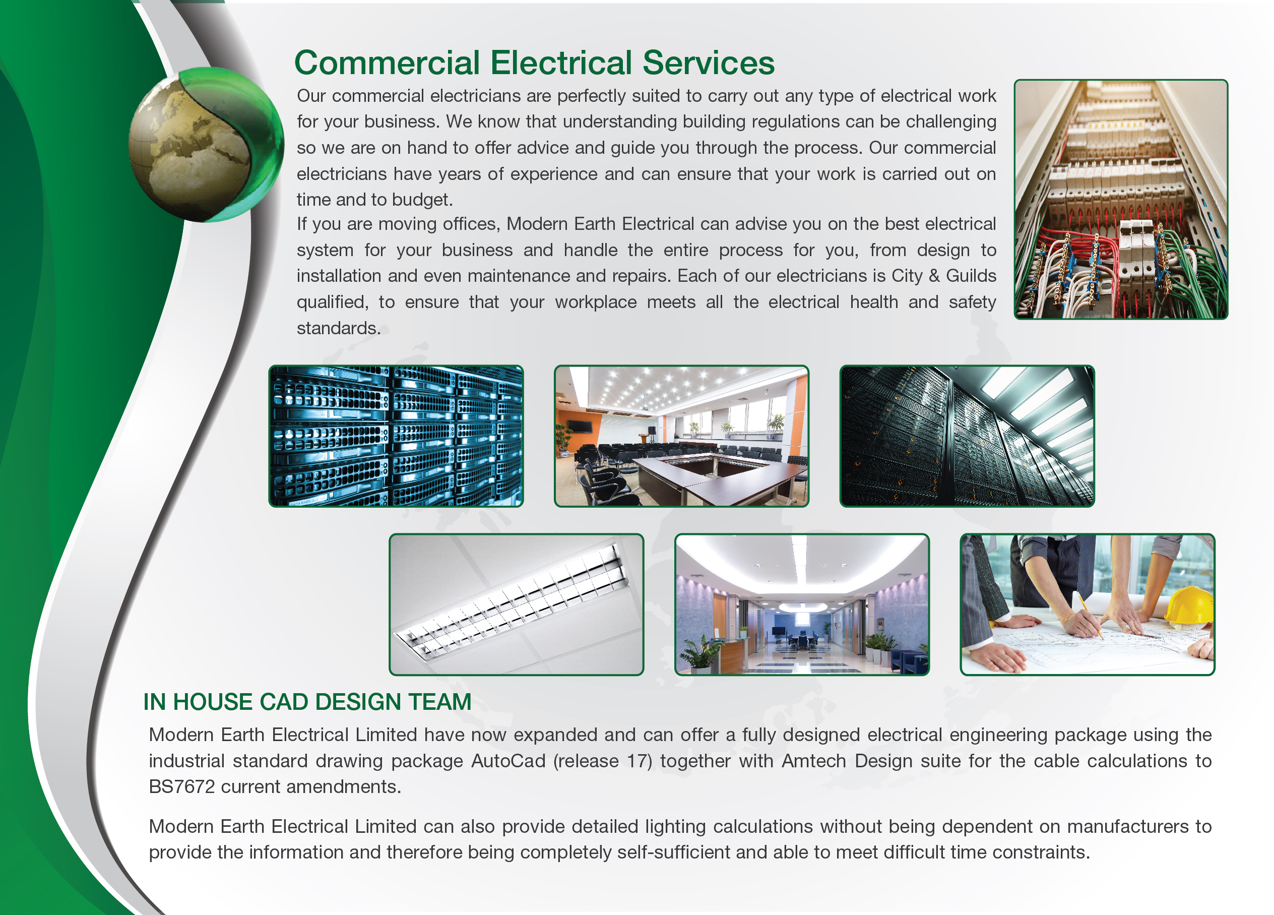 Page 7 and 8 - To be as before for the Commercial side. Add in the globe. Commercial information and the "CAD Design" to remain unchanged. Add in below "lighting and Power systems". This can be spread out over the 2 pages (7&8)
