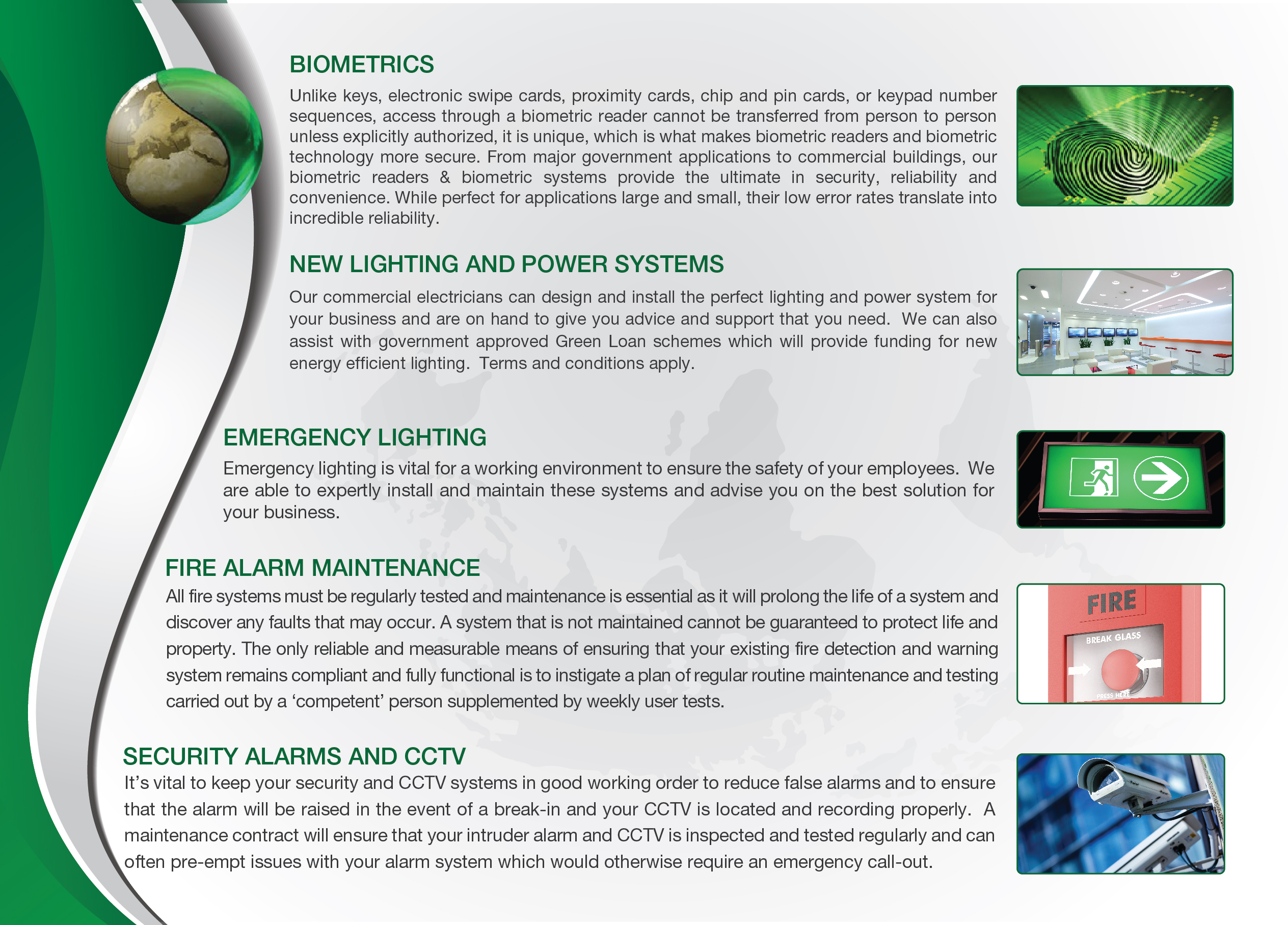 Our commercial electricians can design and install the perfect lighting and power system for your business and are on hand to give you advice and support that you need. We can also assist with government approved Green Loan schemes which will provide funding for new energy efficient lighting. Terms and conditions apply.