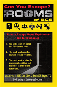 poster for escape room advertising the themes of our rooms, bold, samples attached