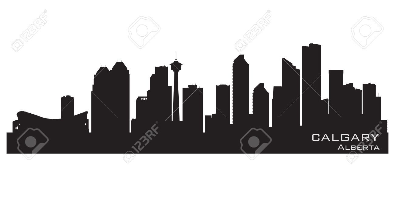 - hockey sticks, silhouette of Calgary landmarks or mountains