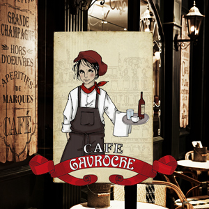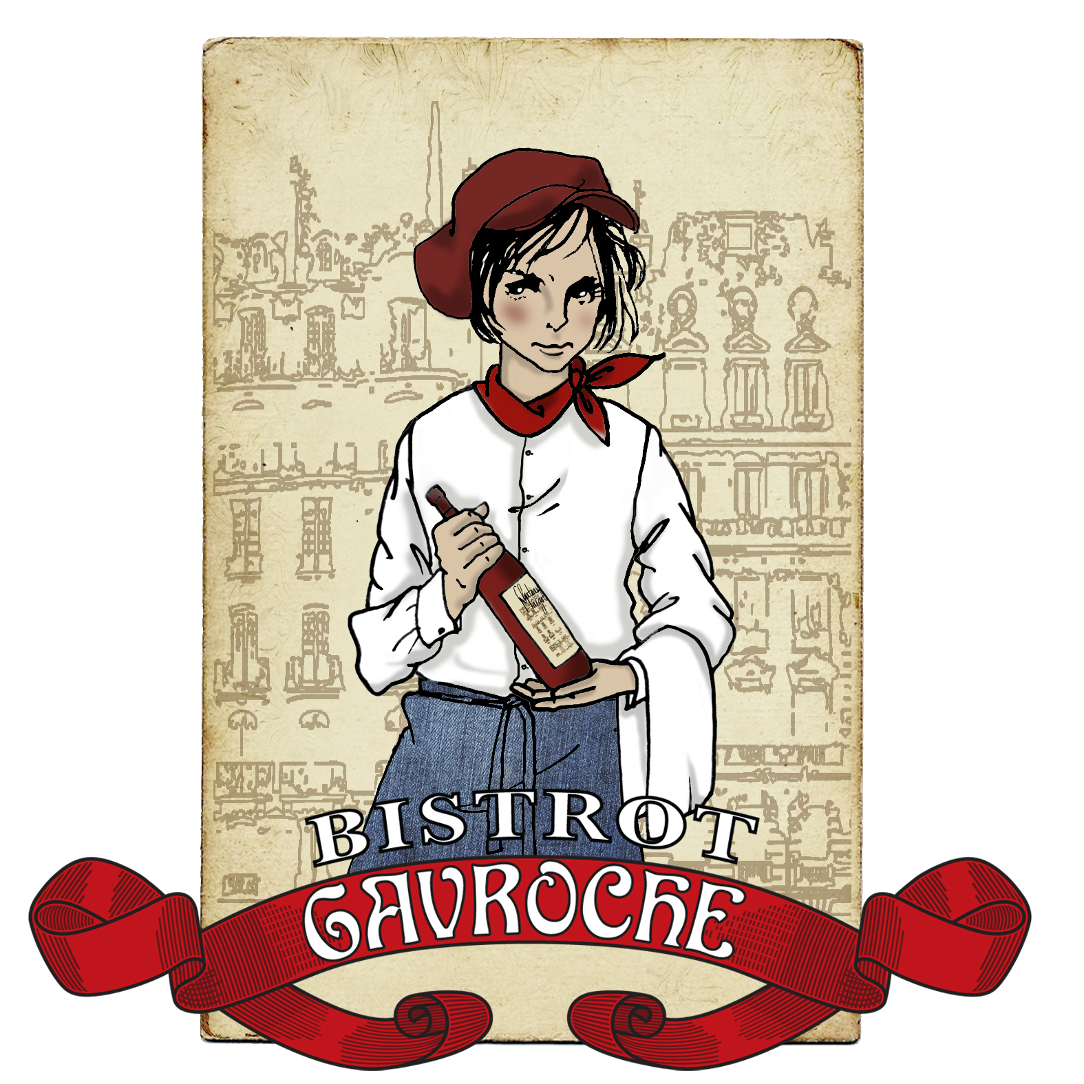 Dear you, welcome! We opened Le Gavroche * restaurant in France in the Alps in 2007, after an experience in Paris and in experience abroad in French cuisine. * 'Gavroche' is the kid from Paris from the novel "The Miserables" Victor Hugo. We show you our present logo (2017) and hope you can offer a new idea about this kid, more modern. We are also a wine bar. Wine is our prime business. Our restaurant appears in the Guide every year since 2013. Please find old logos from 2007 to 2013 for example. We hope something 'light' and easy to understand. Good luck! Magali and Sebastien from France