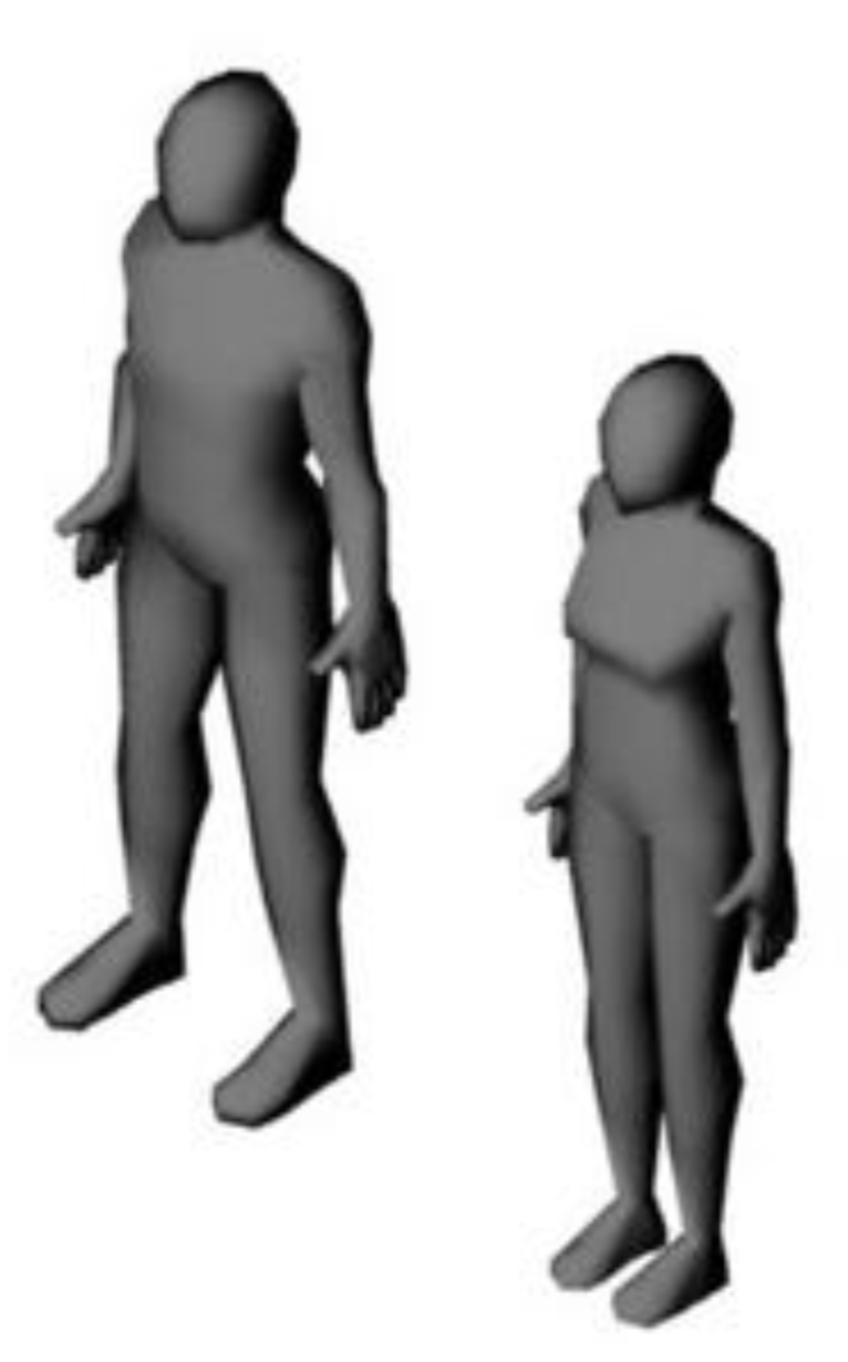 The two figures (male and female) should probably be isometric [4] (30deg angles on each side) - file ‘file-002-isometric-male-female-figures.png’ has been attached to show this. The two human figures in that file would be OK but would better if their hands looked more relaxed rather than straight by their sides, i.e. a more natural hand position.