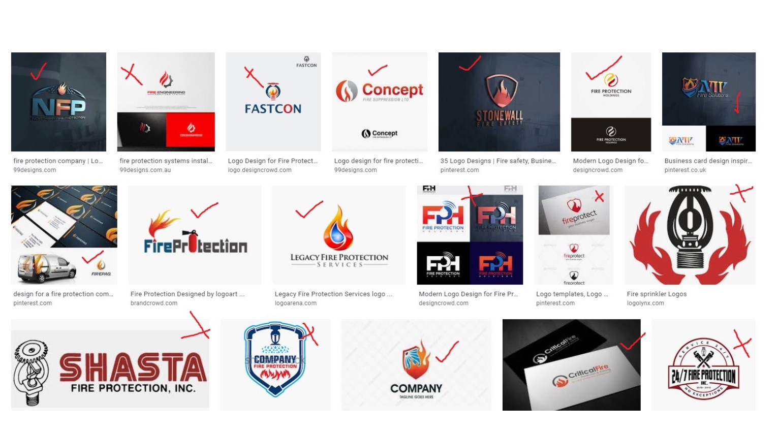Below is a screen shot of other Fire Protection logos with ticks and crosses to indicate our style preference. (EDS logo is also a like).