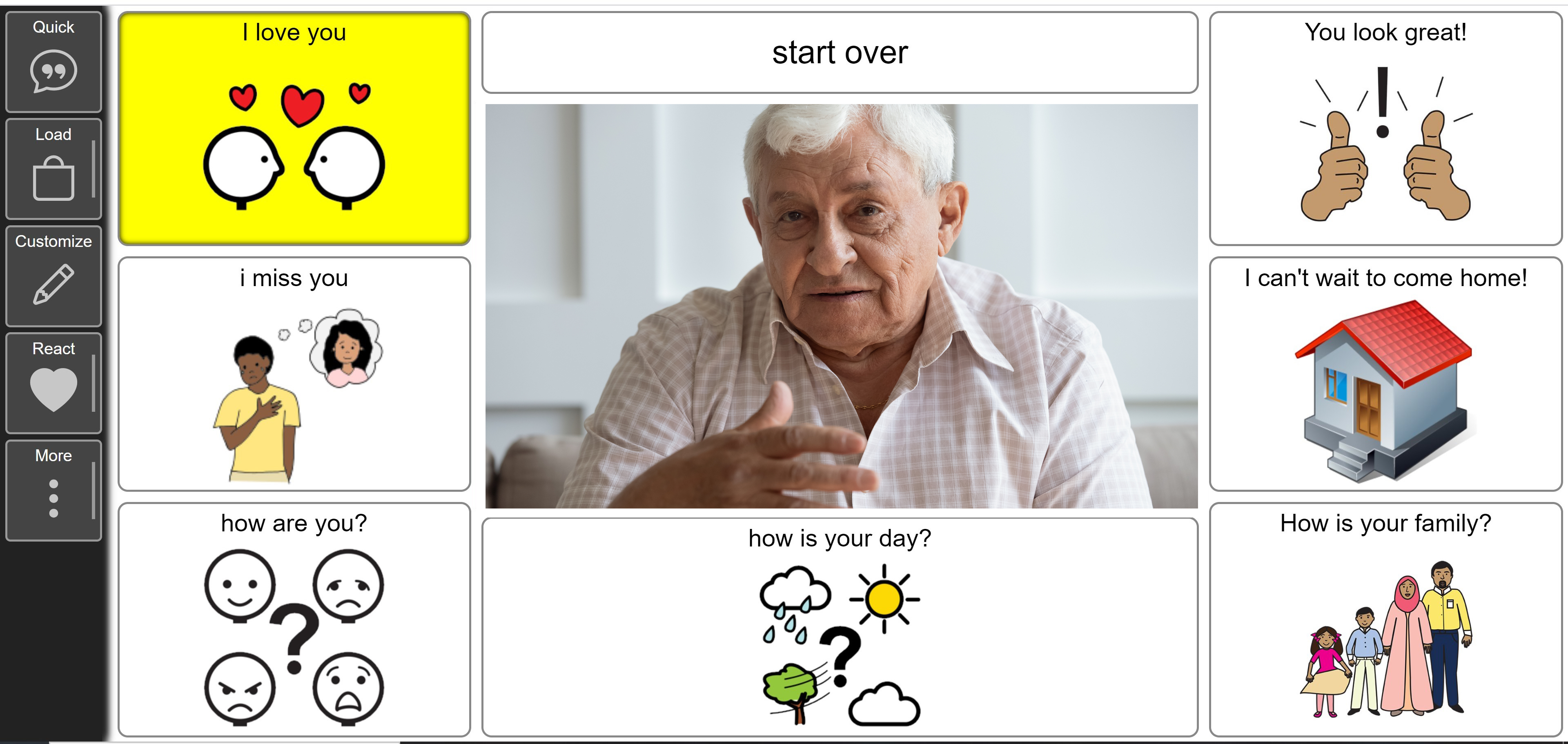 -Co-VidSpeak is a one-on-one video calling platform in which the video feed is surrounded by labeled buttons that will vocalize words and messages between parties. Communication partners can select speech buttons by pressing them or by indicating a button selection with their eyes to share a personal message