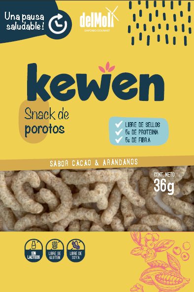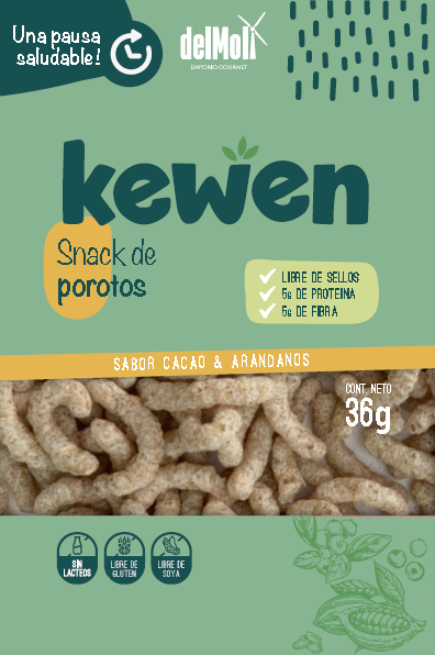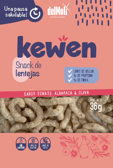 We need a packaging design for a new product of our company. DEL MOLI is a chilean company that born in 2018 to produce healthy breads, alergens free. The new product, call KEWEN, consist in a healthy snack in three versions: