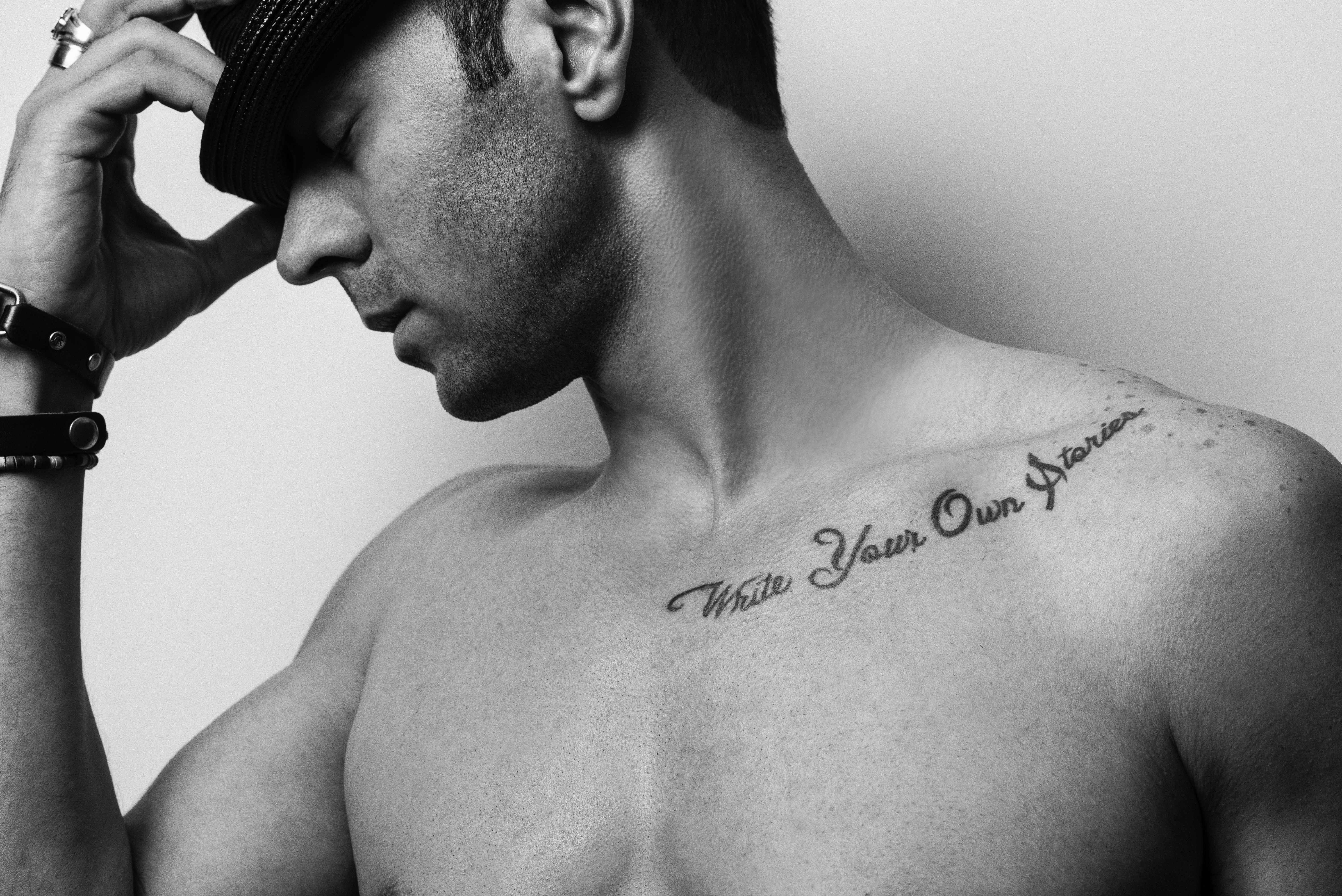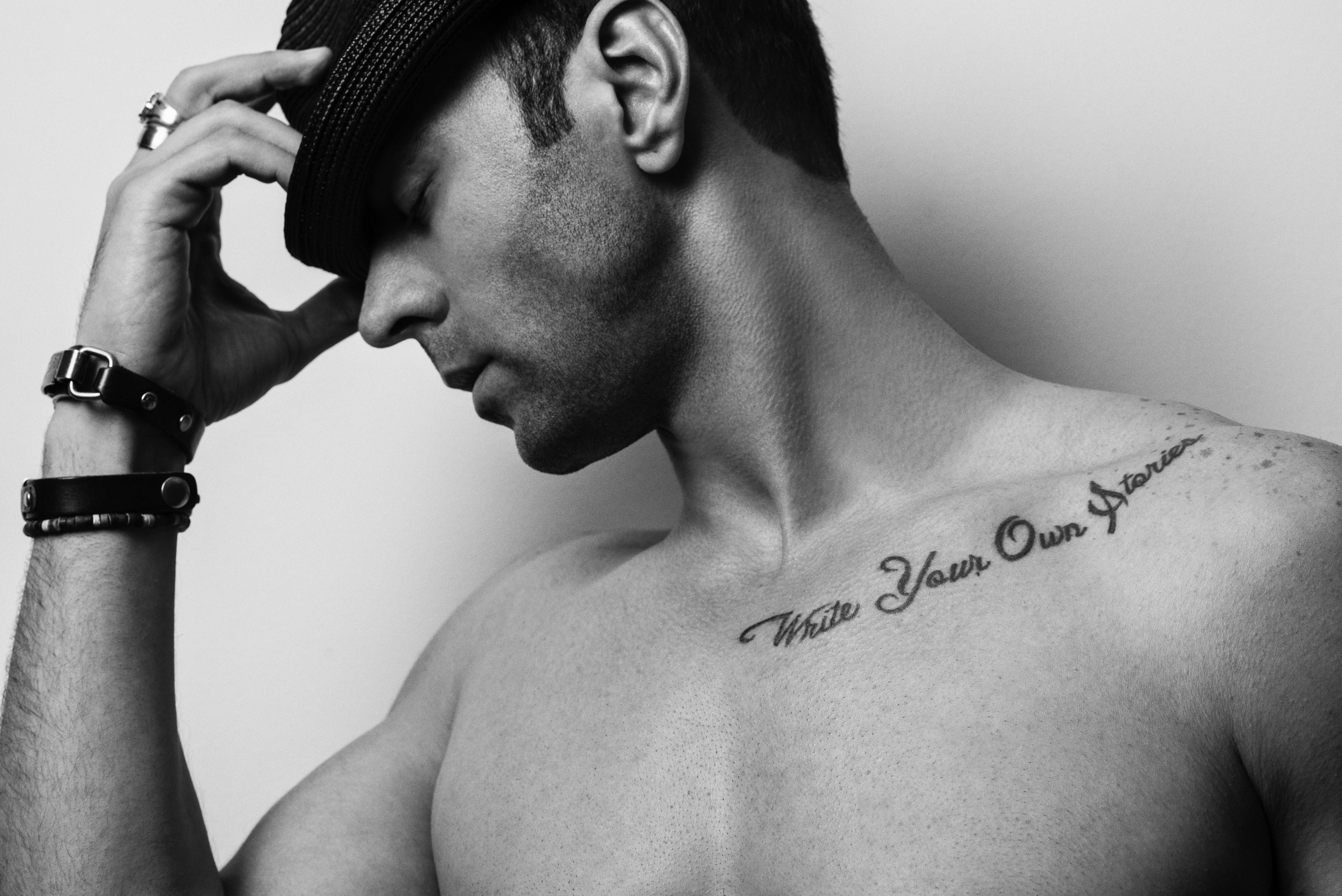 The Album Title is "Write Your Own Stories" which is a Tattoo I have on my chest. I have attached some pictures from a photo shoot I had in NYC. Feel free to use any of them, or if you feel that you want to go in a completely different direction then by all means go ahead and show me what you've got.