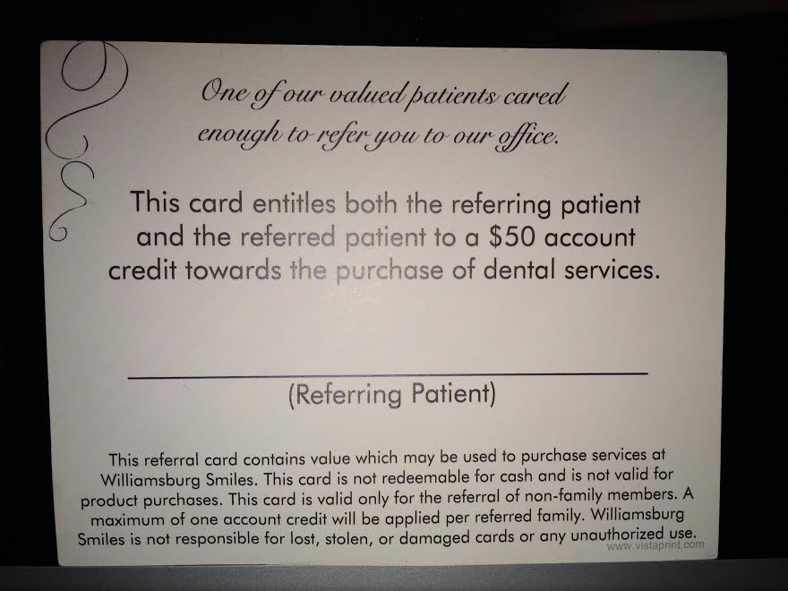 I neaed a referral postcard designed for my dental office to give out to clientele detailing our referral program.