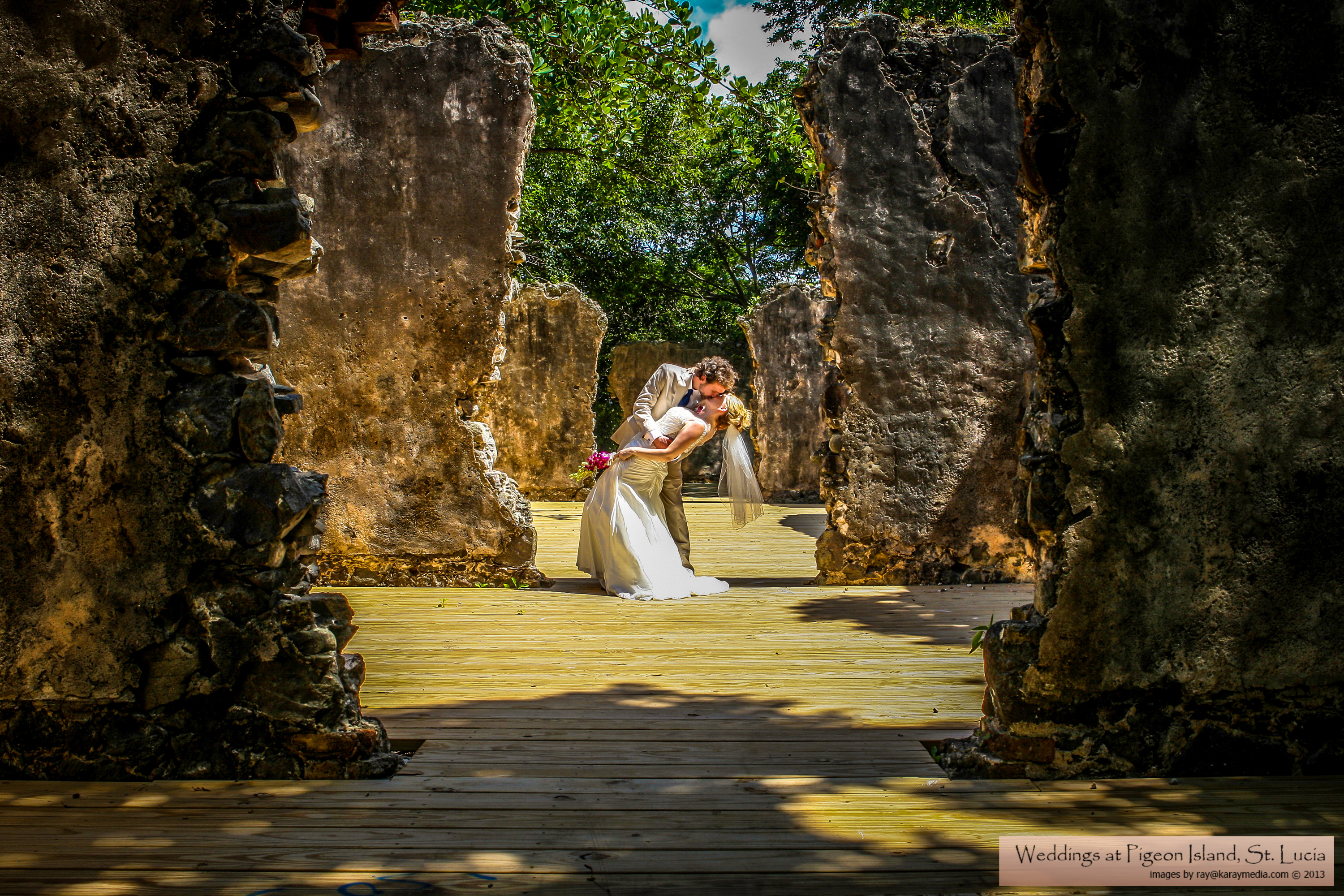 We need a poster designed to promote our venue, the Pigeon Island National Landmark, as a wedding venue. The poster will be 24"x36". Pigeon Island is an historical site with ruins of 18th century military buildings. The ruins lie among old growth and tropical trees.