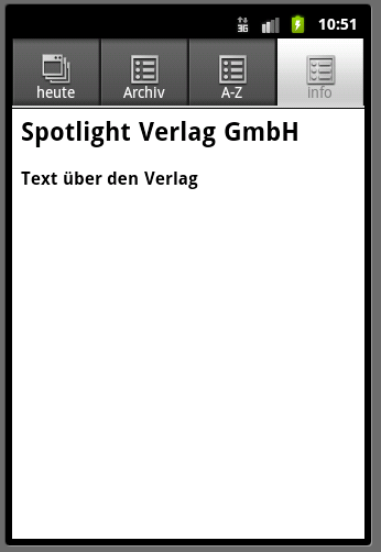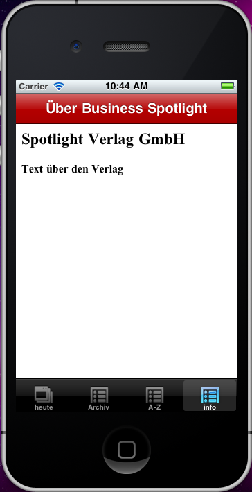 • Screen containing information about our company including a button opening a mobile landing page on the web and the Business Spotlight logo