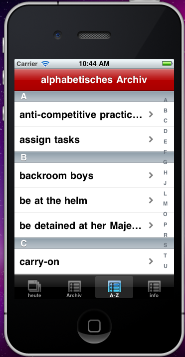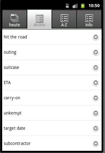 • Screen containing the archive of the last 365 day in an alphabetical order (selecting one word brings up a new screen looking like the word of today)