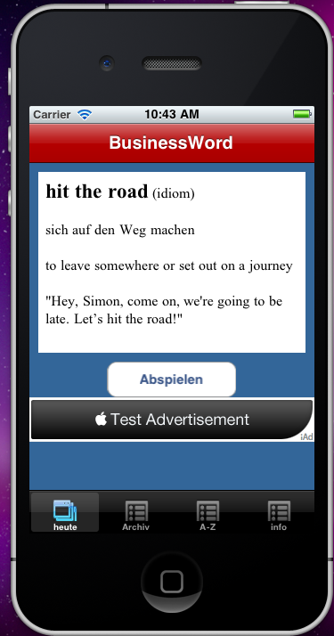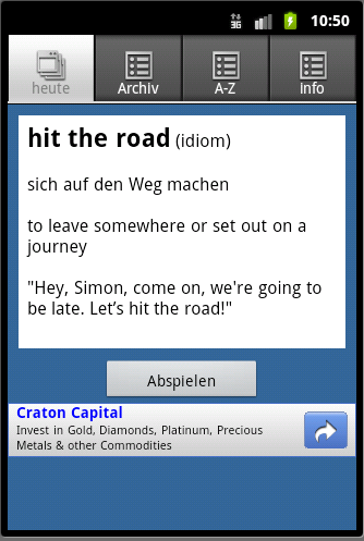• Screen containing the word of the day, optionaly the translation, the type of the word (e.g. Verb), the explanation, an example phrase, the play button to listen to the pronunciation, an optional ad banner and the Business Spotlight logo