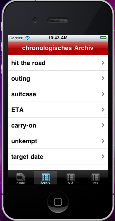 • Screen containing the archive of the last 365 words in a chronological order (selecting one word brings up a new screen looking like the word of today)
