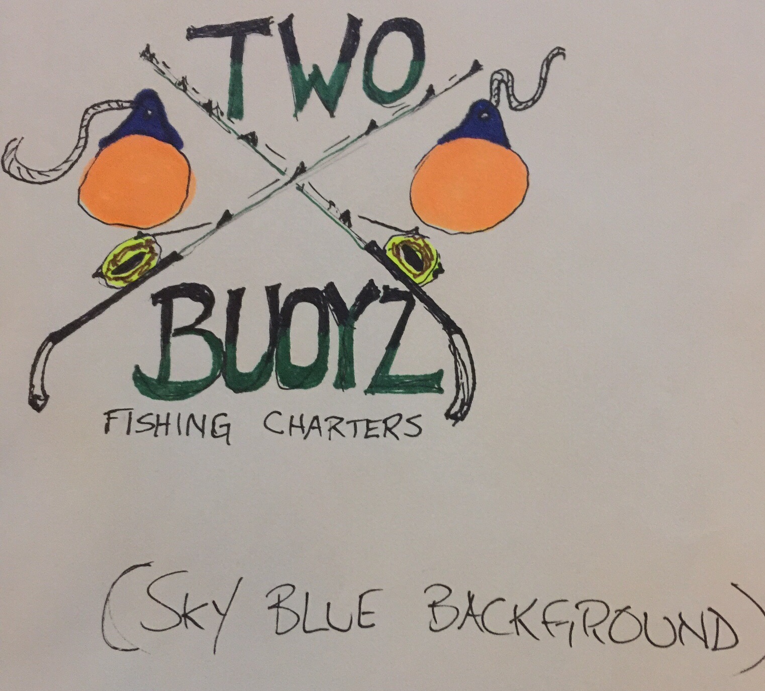 Need a logo design for a new charter fishing business launching in Newport, RI in the spring. Need a high res logo I can use in various applications. The crude scetctch I made is what the general layout should end up like. The two pro rods crossed, the buoys on each side of that "x," the word two on top of the x and buoyz on the bottom. The images attached are examples of graphics I would like combined for a final product with the water image as the background for say, a business card.